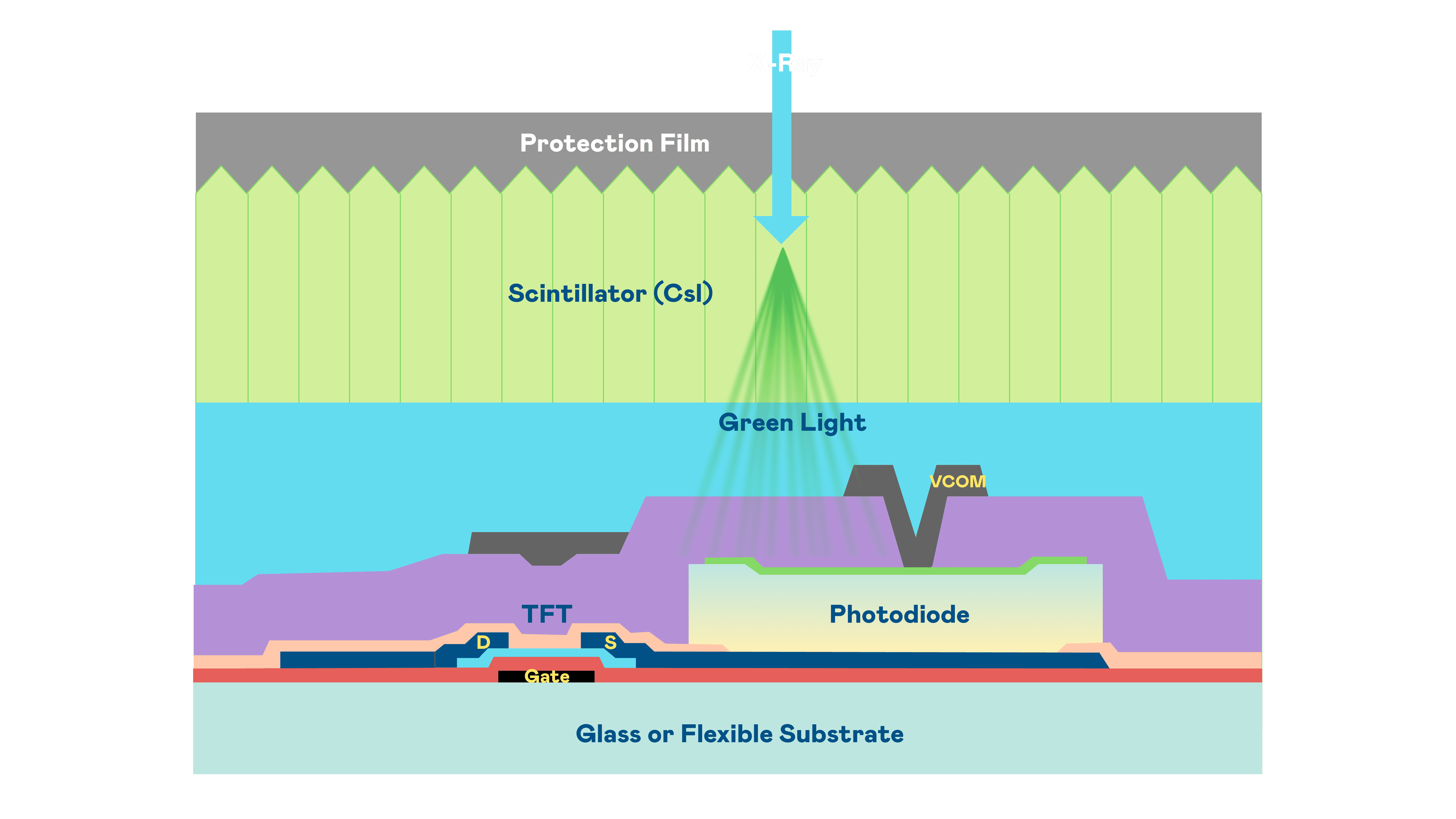 巨星国际的X光影像感测阵列使用薄膜电晶体 (TFT) 作为每个像素的读取开关,,,,搭配光电二极体(Photodiode)的光电转换元件,,,,用以感测X光影像讯号。。。